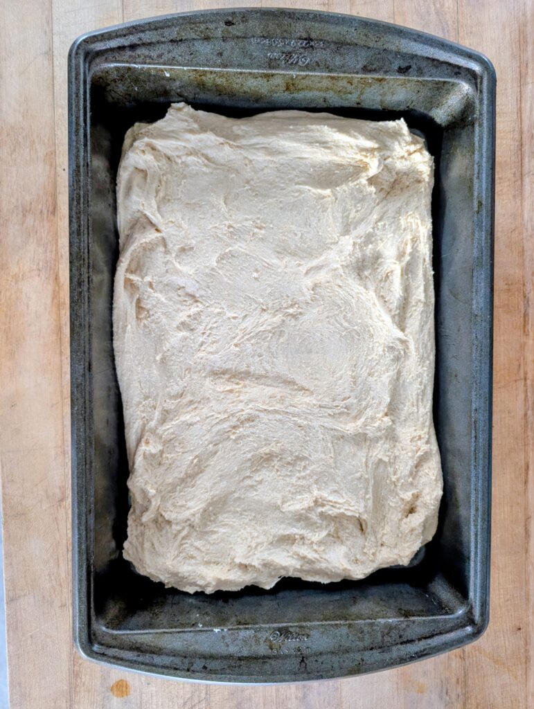 - Place into a 13×9 rectangular pan and press to fill the bottom as best you can, focusing on the corners. Cover and let rise until puffy and jiggles when you shake the pan. This will take roughly 1 to 1.5 hours depending on the temperature.