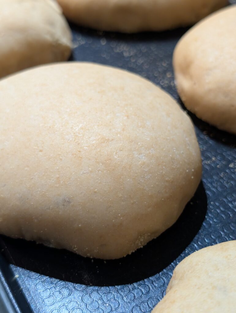 Cover again, and let them rest for 45 minutes to an hour, until they’re puffed and delicate to the touch. They should jiggle slightly when you shake the pan. If you find the finished english muffin does not have enough nooks and crannies, they probably needed to proof longer here.